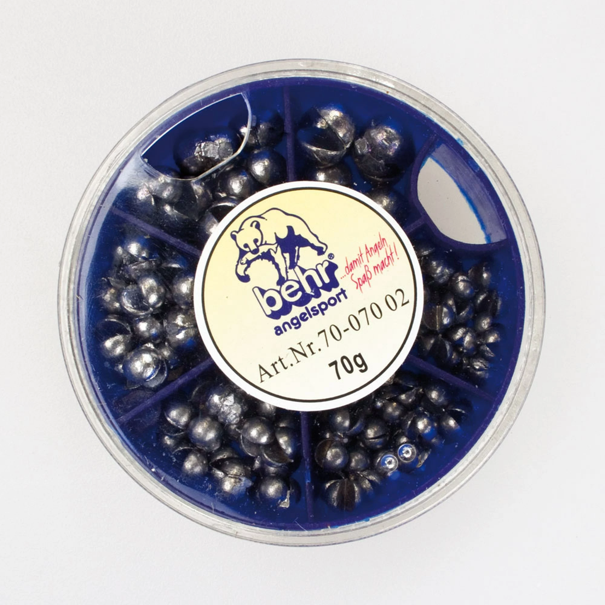 kleine verdeeldoos is gevuld met 6 verschillende maten loodhagel. De inhoud bestaat vooral uit de maten die geschikt zijn voor alle visserij.